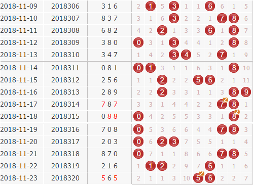 组选分析:在组选分布图上,小号0-2上期开出0枚,本期防0-1枚;中部号码3-6上期开出3枚,本期关注1-2枚;大号7-9上期断开,本期关注1枚;结合组选复隔中分布图,上期开出组选复中中形态,本期关注中码最少开出1-2枚。本期出号条件:复隔码1256=0-2枚,中码034789=1-3枚。