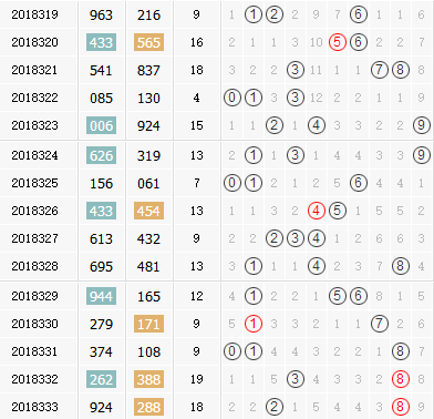 福彩3D第2018333期开奖号为:288,和值为18点,大小形态为小大大,奇偶形态为偶偶偶,跨度值为6。2018334期3d试机号前预测分析: