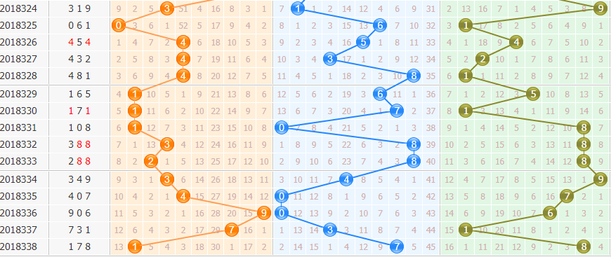 和值分析:上期和值16点,和值上升走势,近期和值走势波动较大,本期重点和值关注17防19点。