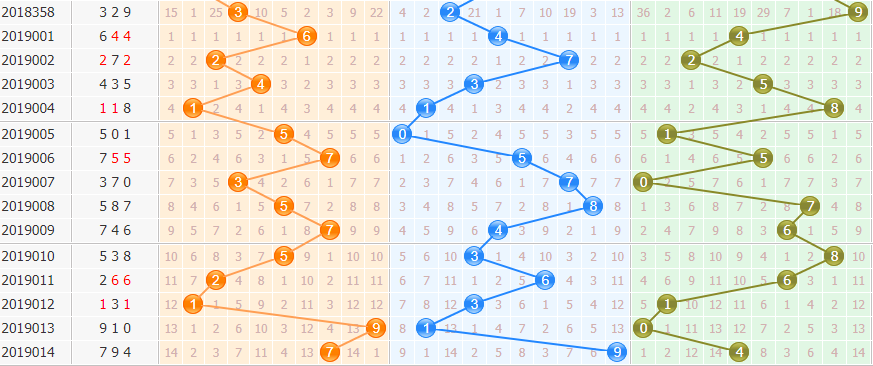 和值分析:上期和值20点,和值上升走势,近期和值走势波动较大,本期重点和值关注14防16点。