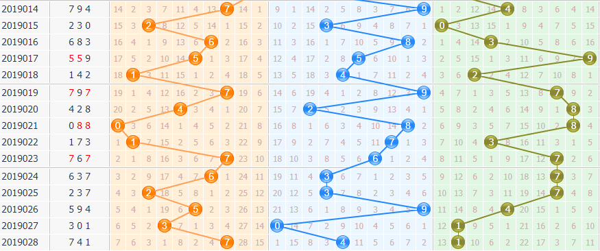 和值分析:上期和值12点,和值上升走势,近期和值走势波动较大,本期重点和值关注17防19点。