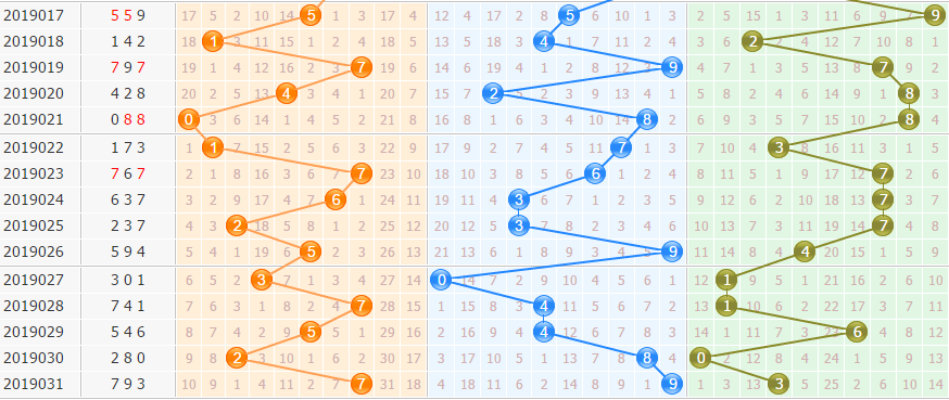 和值分析:上期和值19点,和值上升走势,近期和值走势波动较大,本期重点和值关注13防11点。