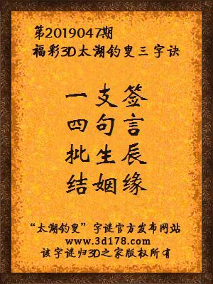 福彩第2019047期3d太湖字谜:一支签,四句言,批生辰,结姻缘