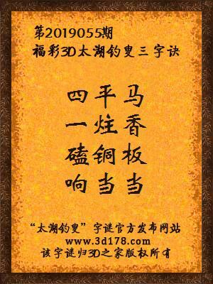 福彩第2019055期3d太湖字谜:四平马,一炷香,磕铜板,响当当