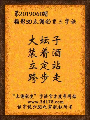 福彩第2019060期3d太湖字谜:大坛子,装着酒,立定站,跨步走