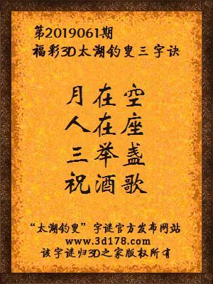 福彩第2019061期3d太湖字谜:月在空,人在座,三举盏,祝酒歌