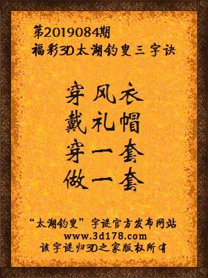 福彩第2019084期3d太湖字谜:穿风衣,戴礼帽,穿一套,做一套