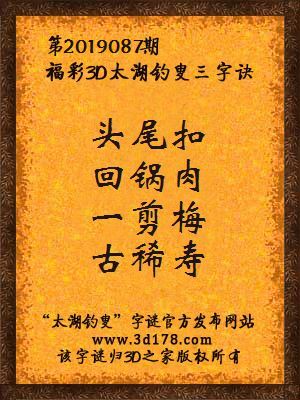 福彩第2019087期3d太湖字谜:头尾扣,回锅肉,一剪梅,古稀寿
