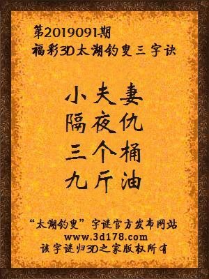 福彩第2019091期3d太湖字谜:小夫妻,隔夜仇,三个桶,九斤油