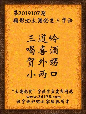 福彩第2019107期3d太湖字谜:三道岭,喝喜酒,贺外甥,小两口