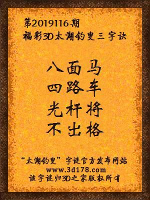 福彩第2019116期3d太湖字谜:八面马,四路车,光杆将,不出格