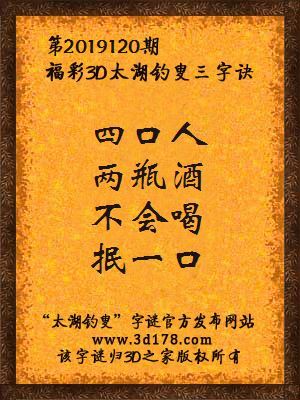 福彩第2019120期3d太湖字谜:四口人,两瓶酒,不会喝,抿一口
