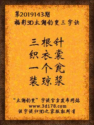 福彩第2019143期3d太湖字谜:三根针,织衣裳,一个瓮,装琼浆