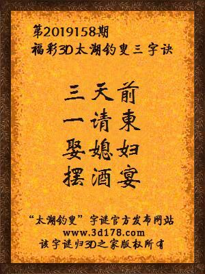 福彩第2019158期3d太湖字谜:三天前,一请柬,娶媳妇,摆酒宴