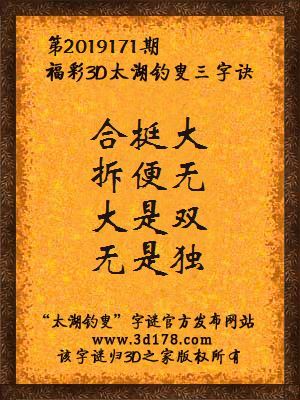 福彩第2019171期3d太湖字谜:合挺大,拆便无,大是双,无是独