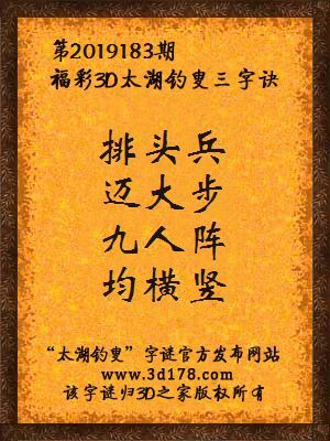 福彩第2019183期3d太湖字谜:排头兵,迈大步,九人阵,均横竖