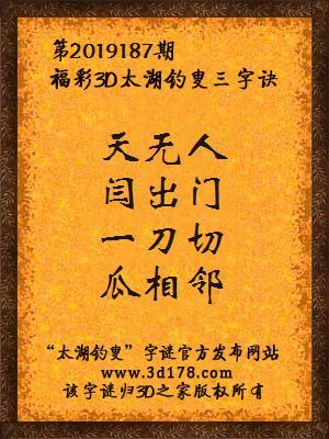福彩第2019187期3d太湖字谜:天无人,闫出门,一刀切,瓜相邻