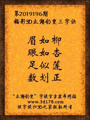 福彩第2019196期3d太湖字谜:眉如柳,眼如杏,足似莲,数划正