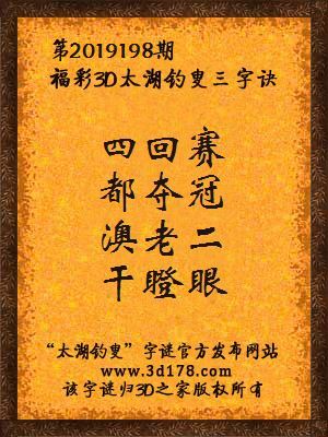 福彩第2019198期3d太湖字谜:四回赛,都夺冠,澳老二,干瞪眼