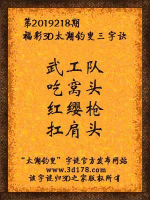 福彩第2019218期3d太湖字谜:武工队,吃窝头,红缨枪,扛肩头