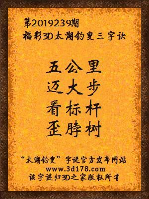 福彩第2019239期3d太湖字谜:五公里,迈大步,看标杆,歪脖树