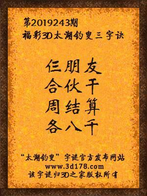 福彩第2019243期3d太湖字谜:仨朋友,合伙干,周结算,各八千