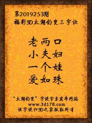 福彩第2019253期3d太湖字谜:老两口,小夫妇,一个娃,爱如珠
