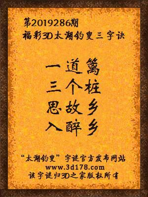 福彩第2019286期3d太湖字谜:一道篱,三个桩,思故乡,入醉乡