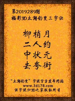 福彩第2019289期3d太湖字谜:柳梢月,二人约,中状元,去夸街