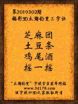 福彩第2019302期3d太湖字谜:芝麻团,土豆条,鸡尾酒,摇一摇