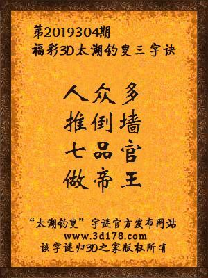 福彩第2019304期3d太湖字谜:人众多,推倒墙,七品官,做帝王