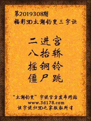 福彩第2019308期3d太湖字谜:二进宫,八抬轿,摇铜铃,僵尸跳