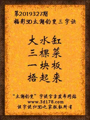 福彩第2019327期3d太湖字谜:大水缸,三棵菜,一块板,捂起来