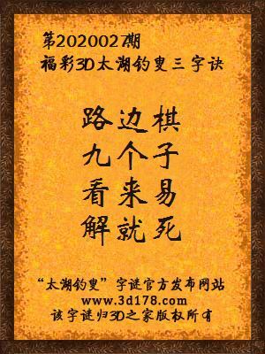 福彩第2020027期3d太湖字谜:路边棋,九个子,看来易,解就死