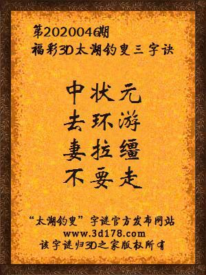 福彩第2020046期3d太湖字谜:中状元,去环游,妻拉缰,不要走