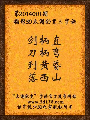 解福彩3d第2014001期太湖字谜剑柄直,直,形解1;刀柄弯,弯,形解7;到黄昏,黄昏,5、6点,解56;落西山,落下山,解2;综合推荐:12567
