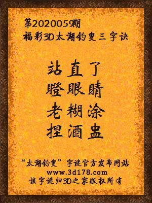 福彩第2020059期3d太湖字谜:站直了,瞪眼睛,老糊涂,捏酒盅