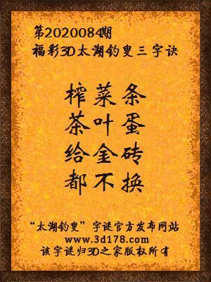 福彩第2020084期3d太湖字谜:榨菜条,茶叶蛋,给金砖,都不换