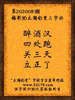 福彩第2020085期3d太湖字谜:醉酒汉,四处跑,关三天,立正了
