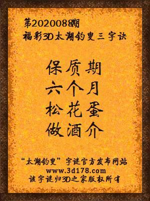 福彩第2020088期3d太湖字谜:保质期,六个月,松花蛋,做酒介