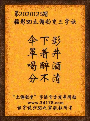 福彩第2020125期3d太湖字谜:伞下影,罩着井,喝醉酒,分不清