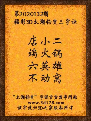 福彩第2020132期3d太湖字谜:店小二,端火锅,六英雄,不动窝