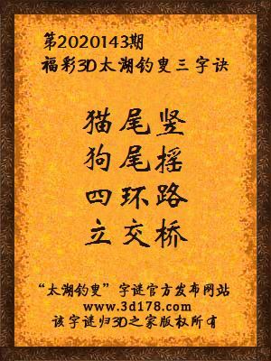 福彩第2020143期3d太湖字谜:猫尾竖,狗尾摇,四环路,立交桥