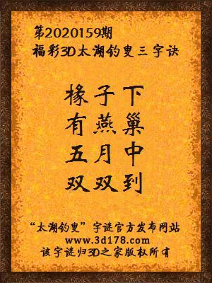 福彩第2020159期3d太湖字谜:椽子下,有燕巢,五月中,双双到