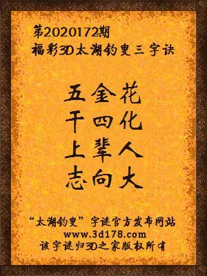 福彩第2020172期3d太湖字谜:五金花,干四化,上辈人,志向大