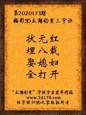 福彩第2020173期3d太湖字谜:状元红,埋八载,娶媳妇,全打开