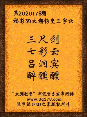 福彩第2020178期3d太湖字谜:三尺剑,七彩云,吕洞宾,醉醺醺。