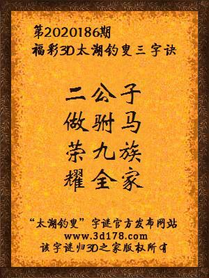 福彩第2020186期3d太湖字谜:二公子,做驸马,荣九族,耀全家