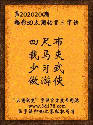 福彩第2020200期3d太湖字谜:四尺布,裁马夹,少习武,做游侠