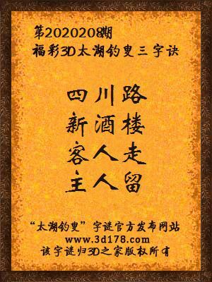 福彩第2020208期3d太湖字谜:四川路,新酒楼,客人走,主人留